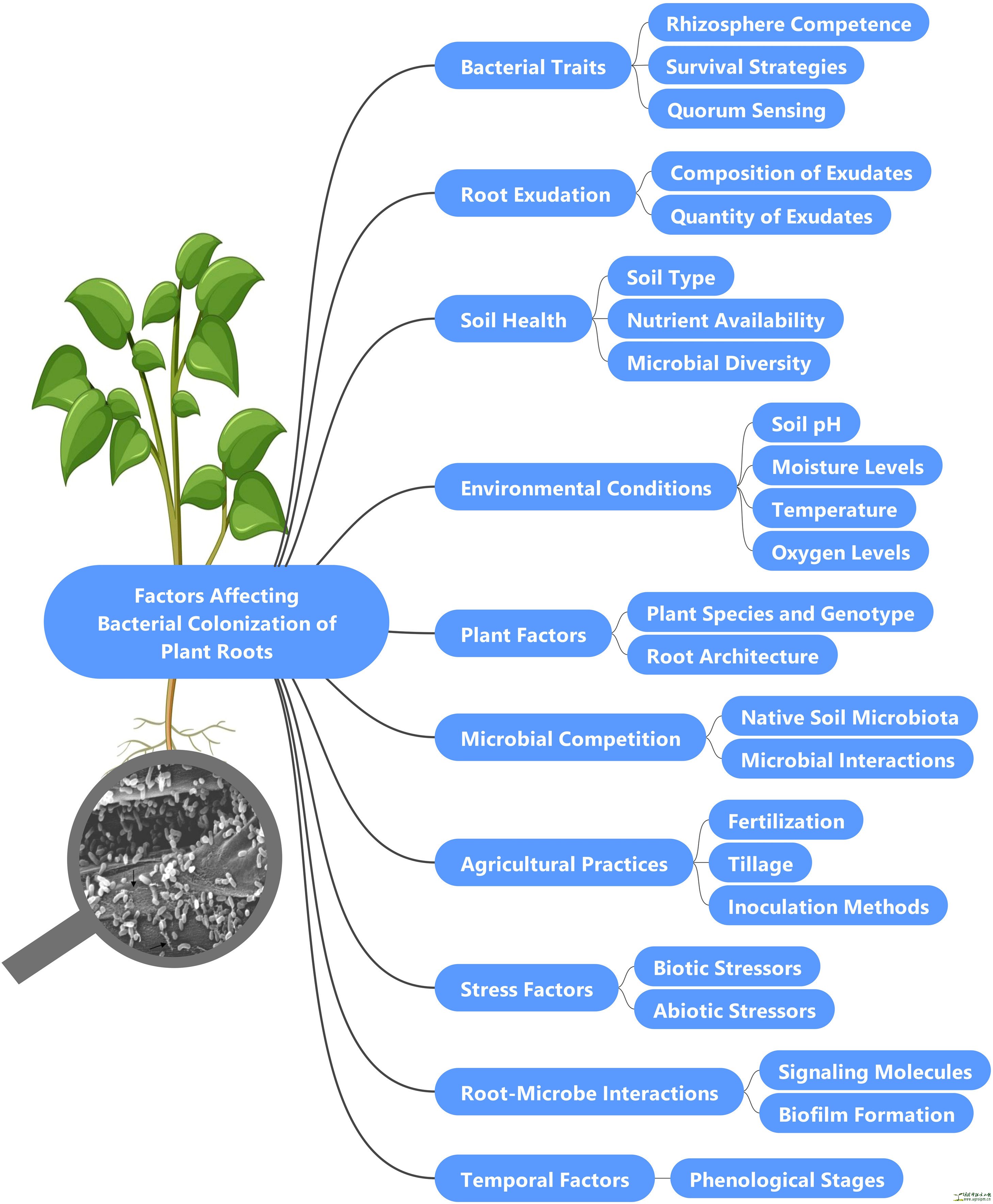 Fig. 2. Factors affecting bacterial colonization of plant roots. Bacterial colonization of plant roots is influenced by a variety of interconnected factors. Key bacterial traits, such as rhizosphere competence and survival strategies, play a crucial role in their ability to establish on roots. The composition and quantity of root exudates, which include sugars, amino acids, and organic acids, significantly impact microbial attraction and growth. Soil health, characterized by soil type, nutrient availability, and microbial diversity, is essential for effective colonization. Environmental conditions, including soil pH, moisture levels, temperature, and oxygen availability, also affect bacterial activity. Additionally, plant species and genotype influence microbial community selection, while competition with native soil microbiota can limit the success of introduced plant growth-promoting bacteria (PGPB). Agricultural practices, such as fertilization and tillage, further alter microbial dynamics, and various stress factors, both biotic and abiotic, can hinder bacterial colonization. Root-microbe interactions, facilitated by signaling molecules and biofilm formation, enhance attachment to plant roots, while temporal factors related to the plant’s phenological stages can shape colonization patterns.