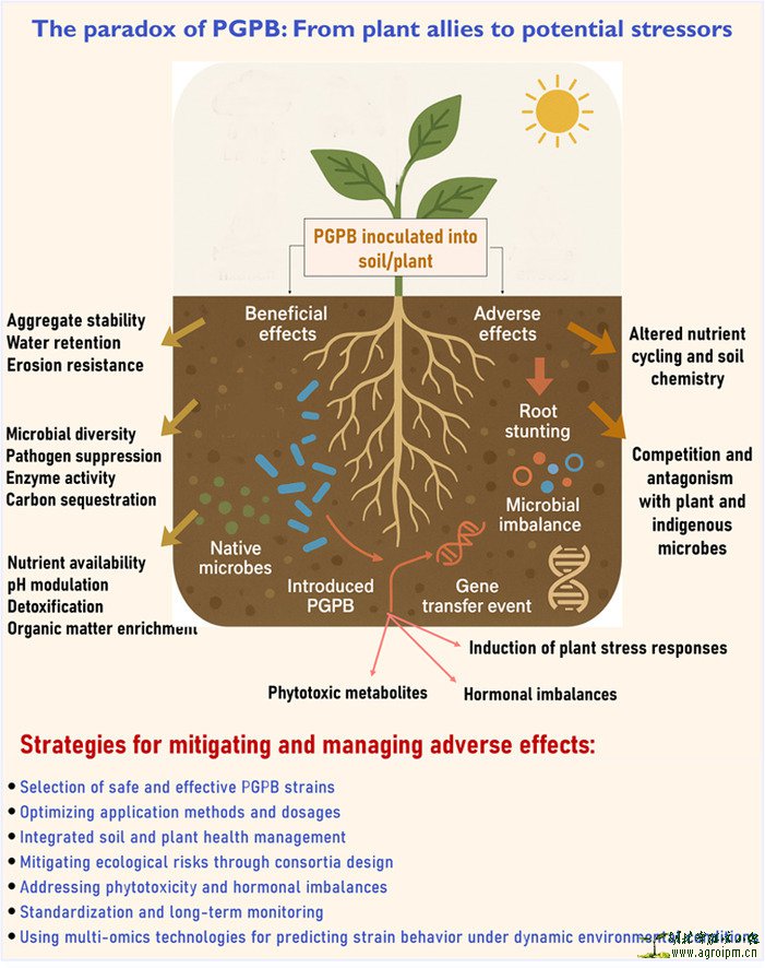 植物促生菌(PGPB)在可持续农业中具有关键作用,能提高作物产量并减少对化学投入品的依赖。然而其作为有益微生物与潜在胁迫因子的双重角色仍研究不足。本综述探讨了PGPB的矛盾性负面效应,对当前普遍乐观的应用叙事提出了质疑。在植物层面上,其非预期后果包括:激素失衡(如生长素诱导的根系抑制)、植物毒性代谢产物生成(如氰化氢),以及生长与防御机制之间的平衡。在土壤层面,风险包括微生物多样性破坏、养分循环改变以及可能增强致病性的水平基因转移。这些结果由环境因素(土壤pH值和湿度)、宿主特异性相互作用以及施用方式所驱动。缓解策略强调严格的菌株选择、剂量优化及综合土壤管理,以实现功效与生态安全的平衡。植物促生菌(PGPB)的部署需要综合考量微生物生态学、风险评估框架及农业生态系统动态。多组学技术与合成菌群设计的进步为预测菌株行为提供了新见解,而长期生态评估对于解决历史遗留影响至关重要。本综述强调必须采用精细化的循证方法实施PGPB,协调农业效益与环境管理的关系。通过填补微生物生态学和风险评估领域的知识空白,本研究支持优先保障农业韧性与土壤生物多样性的策略,以确保PGPB为全球粮食安全作出可持续贡献。