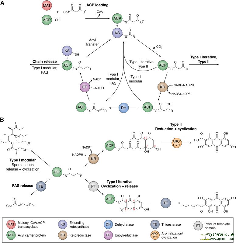 A generalized biosynthetic scheme for type I and II PKSs.