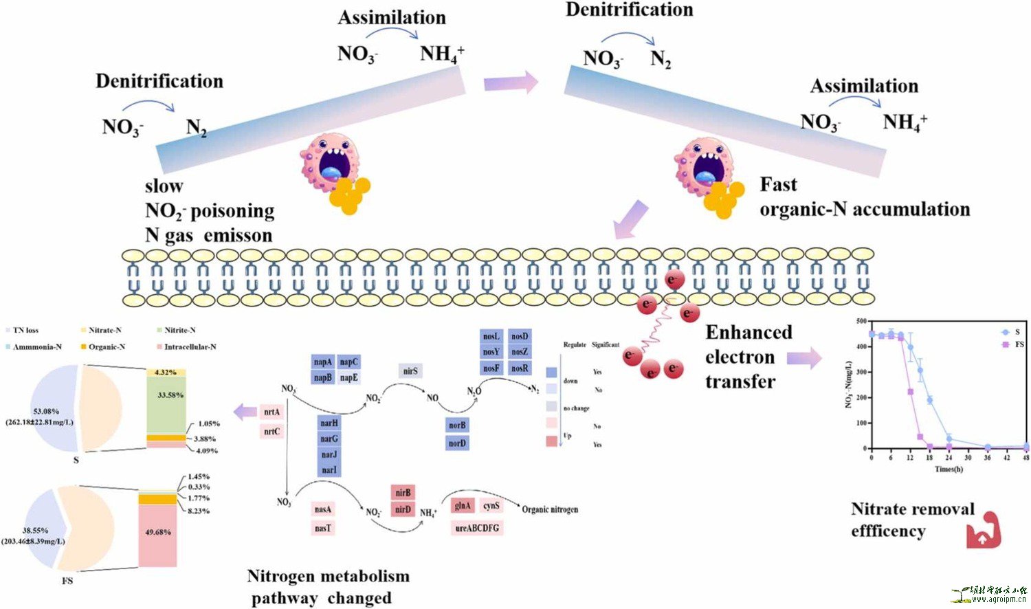 硝酸盐是导致土壤次生盐渍化的主要阴离子。然而,由于去除速率缓慢、产生毒性副产物以及造成氮素损失,微生物反硝化作用在土壤修复中的应用受到限制。本研究首次发现,褐藻糖胶(fucoidan)作为外源营养刺激剂可显著促进施氏假单胞菌(Stutzerimonas frequens)S4的生长并提高其硝酸盐去除效率。与对照组相比,9–18 h内硝酸盐去除效率提升了58.62%,去除速率由28.64 mg/L/h提高至48.42 mg/L/h。机制研究表明,去除速率的提升与褐藻糖胶促进的电子传递活性增强密切相关;同时,嘌呤、核酸及辅因子合成等代谢通路上调,为微生物生长及反硝化作用提供了能量。此外,褐藻糖胶可调控硝酸盐转化通路,提高硝酸盐同化比例,从而减少亚硝酸盐及气态氮素的排放,并提升有机氮和胞内氮水平。转录组学分析显示,褐藻糖胶通过显著抑制反硝化功能基因并上调同化相关基因实现上述效应。本研究阐明了褐藻糖胶增强微生物硝酸盐去除能力的分子机制,为其在次生盐渍化土壤修复中的应用提供了新的理论依据。