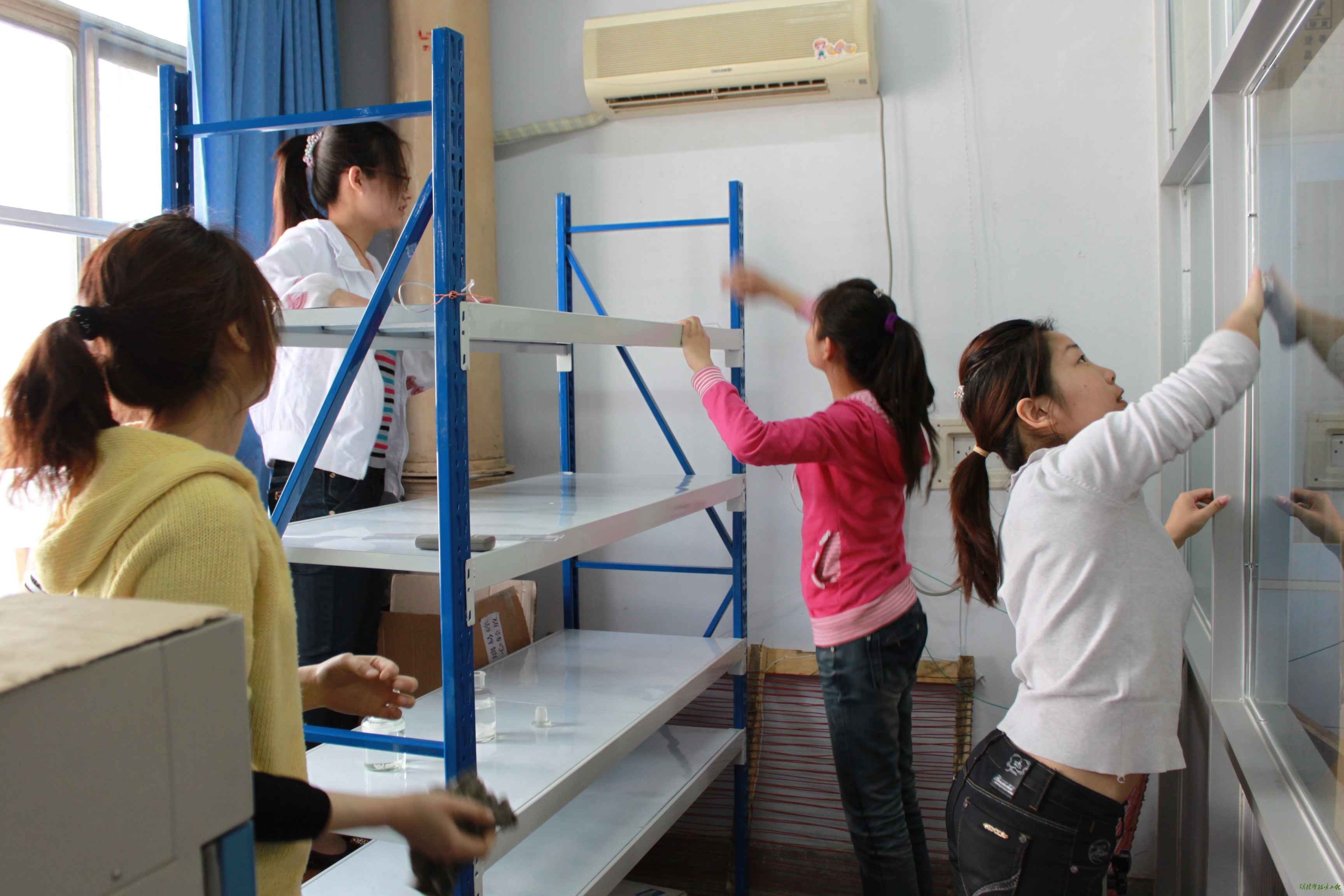 为了保证微生物培养间的清洁,不影响微生物实验的正常进行,4月18日上午李肖、侯丹等同学对微生物培养间做了整理和打扫工作,并进行消毒灭菌。