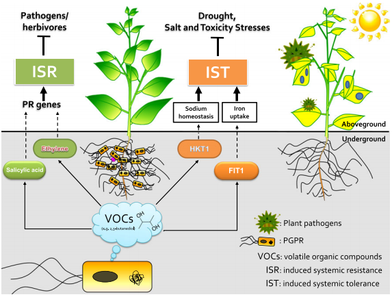 Model of induced systemic resistance (ISR) and induced systemic tolerance (IST) mechanisms elicited by volatile organic compounds (VOCs) emitted from plant growth-promoting rhizobacteria. ISR and IST elicited by plant growth-promoting rhizobacteria (PGPR) against biotic and abiotic stresses respectively underground (root) and aboveground (shoot). Broken arrows indicate plant responses through individual regulatory component in plants; solid arrows indicate plant compounds affected by bacterial VOCs. Some PGPR strains, indicated in yellowish rods on the plant roots, produce VOCs such as 2,3-butanediol, which results in upregulated pathogenesis-related (PR) genes via salicylic acid and ethylene signalling pathways conferring ISR against phytopathogens and herbivores. Bacterial VOCs downregulate HKT1 expression in roots but upregulate it in shoot tissues, orchestrating lower Na+ levels and recirculation of Na+ and upregulate FIT1 in the whole plant under high salt, metal toxicity, and drought conditions. Abbreviations: FIT1, Fedeficiency- induced transcription factor 1; HKT1, high-affinity K+ transporter 1; ISR, induced systemic resistance; IST, induced systemic tolerance; PGPR, plant-growth-promoting rhizobacteria.