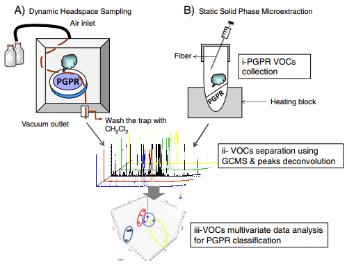 Proposed scheme for volatile analysis procedure from plant growth-promoting rhizobacteria (PGPR) showing the following steps: I) volatile collection using either a dynamic headspace sampling by blowing humidified air over PGPR cultures and venting through adsorbent filters, or b static solid phase microextraction (SPME) using fibers, later desorbed inside GC, followed by II) volatile analysis using GC/MS and peaks deconvolution using AMDIS software, allowing for the resolution of complex volatile blend components, III) multivariate data analysis i.e., principal component analysis (PCA) to help reveal differences and similarities between PGPR strains.