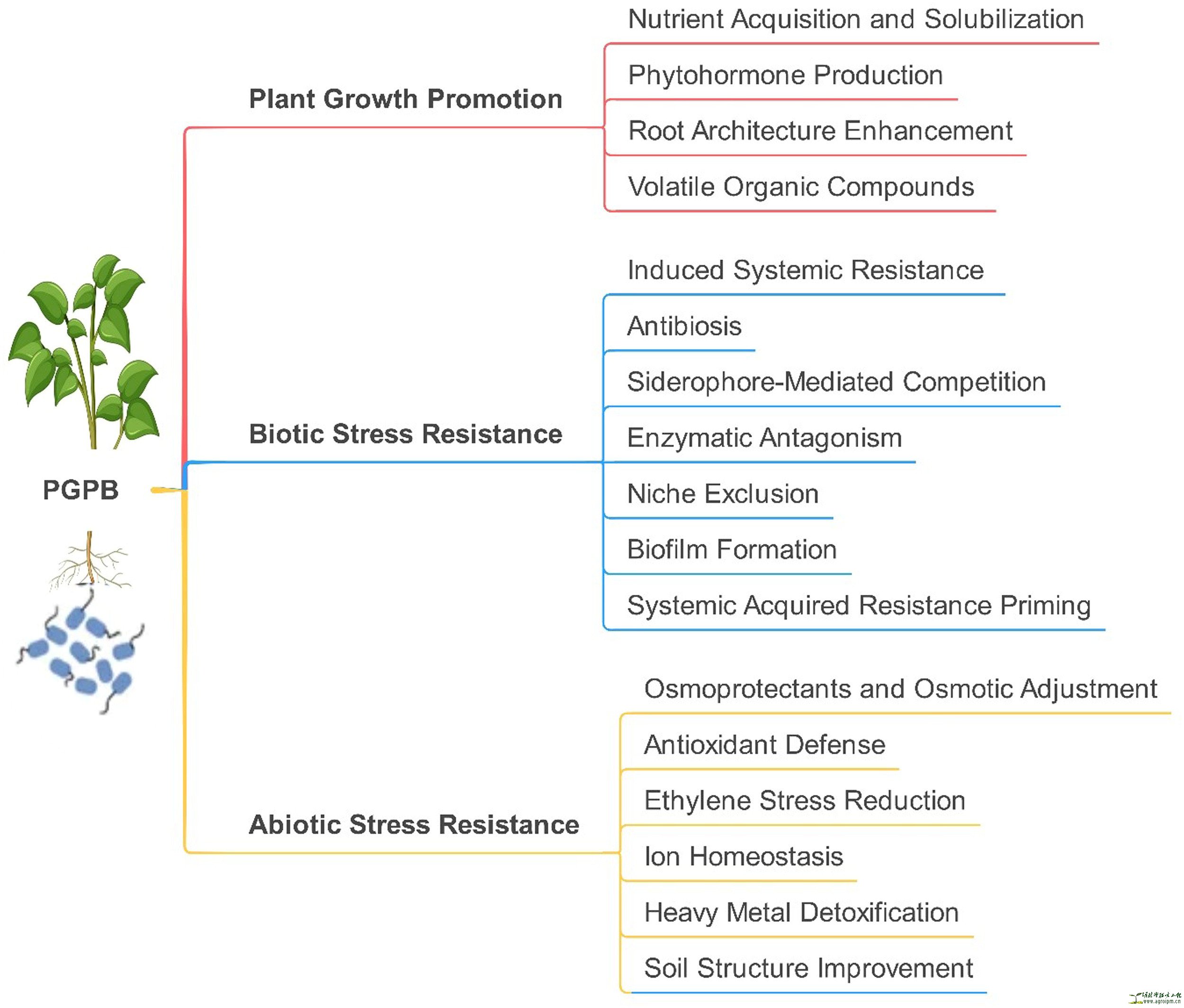 植物促生菌(PGPB)在可持续农业中具有关键作用,能提高作物产量并减少对化学投入品的依赖。然而其作为有益微生物与潜在胁迫因子的双重角色仍研究不足。本综述探讨了PGPB的矛盾性负面效应,对当前普遍乐观的应用叙事提出了质疑。在植物层面上,其非预期后果包括:激素失衡(如生长素诱导的根系抑制)、植物毒性代谢产物生成(如氰化氢),以及生长与防御机制之间的平衡。在土壤层面,风险包括微生物多样性破坏、养分循环改变以及可能增强致病性的水平基因转移。这些结果由环境因素(土壤pH值和湿度)、宿主特异性相互作用以及施用方式所驱动。缓解策略强调严格的菌株选择、剂量优化及综合土壤管理,以实现功效与生态安全的平衡。植物促生菌(PGPB)的部署需要综合考量微生物生态学、风险评估框架及农业生态系统动态。多组学技术与合成菌群设计的进步为预测菌株行为提供了新见解,而长期生态评估对于解决历史遗留影响至关重要。本综述强调必须采用精细化的循证方法实施PGPB,协调农业效益与环境管理的关系。通过填补微生物生态学和风险评估领域的知识空白,本研究支持优先保障农业韧性与土壤生物多样性的策略,以确保PGPB为全球粮食安全作出可持续贡献。