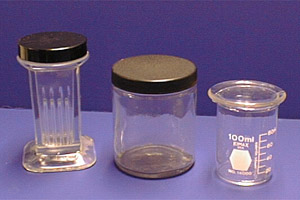 The developing container for TLC can be a specially designed chamber, a jar with a lid, or a beaker with a watch glass on the top: