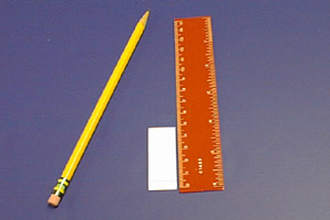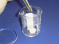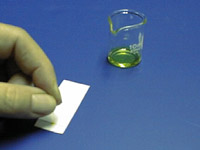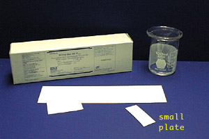 Shown in the photo to the left is a box of TLC plates, a large un-cut TLC sheet, and a small TLC plate which has been cut to a convenient size. Plates will usually be cut and ready for you when you come to lab.
