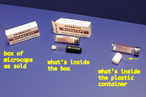 Microcaps come in plastic vials inside red-and-white boxes. If you are opening a new vial, you will need to take off the silver cap, remove the white styrofoam plug, and put the silver cap back on. A small hole in the silver cap allows you to shake out one microcap at a time. Microcaps are very tiny; the arrow points to one, and it is hard to see in the photo.