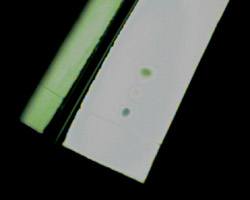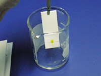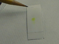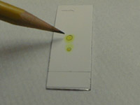 Take a microcap and dip it into the solution of the sample to be spotted. Then, touch the end of the microcap gently to the adsorbent on the origin in the place which you have marked for the sample. Let all of the contents of the microcap run onto the plate. Be careful not to disturb the coating of adsorbent.