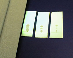 The plate to the left shows three compounds run at three different concentrations. The middle and right plate show reasonable spots; the left plate is run too concentrated and the spots are running together, making it difficult to get a good and accurate Rf reading.