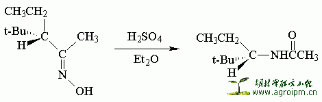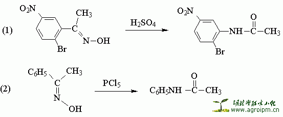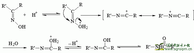 在酸作用下,肟首先发生质子化,然后脱去一分子水,同时与羟基处于反位的基团迁移到缺电子的氮原子上,所形成的碳正离子与水反应得到酰胺。