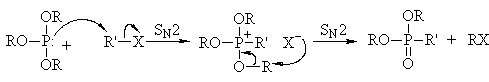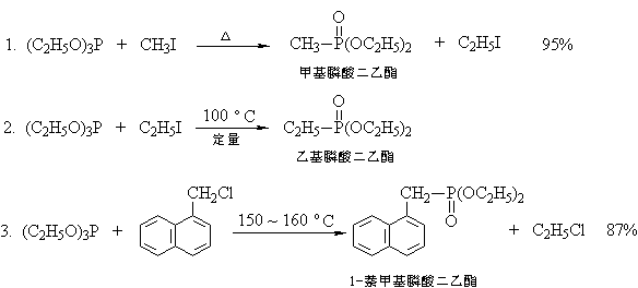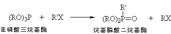 卤代烷反应时,其活性次序为:R'I >R'Br >R'Cl。除了卤代烷外,烯丙型或炔丙型卤化物、a-卤代醚、a- 或 b-卤代酸酯、对甲苯磺酸酯等也可以进行反应。当亚磷酸三烷基酯中三个烷基各不相同时,总是先脱除含碳原子数最少的基团。