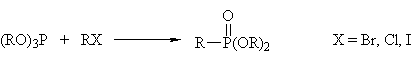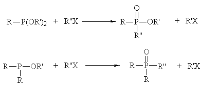 除了亚磷酸三烷基酯外,亚膦酸酯 RP(OR')2 和次亚膦酸酯 R2POR' 也能发生该类反应,例如: