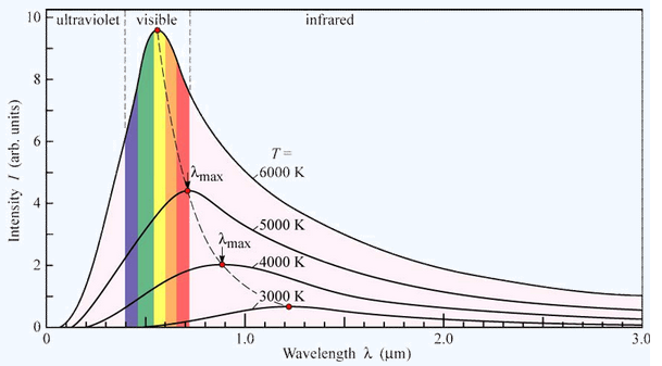 Spectral intensity distribution of Planck’s black-body radiation as a function of wavelength for different temperatures.