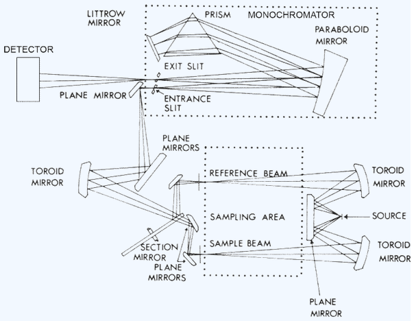 A beam of IR radiation is produced and split into two separate beams. One is passed through the sample, the other is passed through a reference which is often the solvent. The beams pass through a splitter (the section mirror) which quickly alternates which of the two beams enters the monochromator. A monochromator is an optical device that transmits a mechanically selectable narrow band of wavelengths of radiation chosen from a wider range of wavelengths available at the input. The monochromator makes it possible to scan through the spectrum. Finally, the beams are both directed towards a detector. The two signals are then compared and a printout is obtained. A reference sample is used for two reasons: this prevents fluctuations in the output of the source affecting the data and this allows the effects of the solvent to be cancelled out.