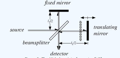 Another measurement technique for collecting IR spectra is Fourier Transform Infrared (FTIR) spectroscopy. Instead of recording the amount of energy absorbed when the frequency of the IR radiation is varied by a monochromator, the IR radiation is guided through an interferometer. The purpose of the interferometer is to have a beam of IR radiation, split it into two beams, and make one of the beams travel a different (optical) distance than the other in order to create alternating interference fringes. A diagram of a Michelson interferometer is shown in the next figure.