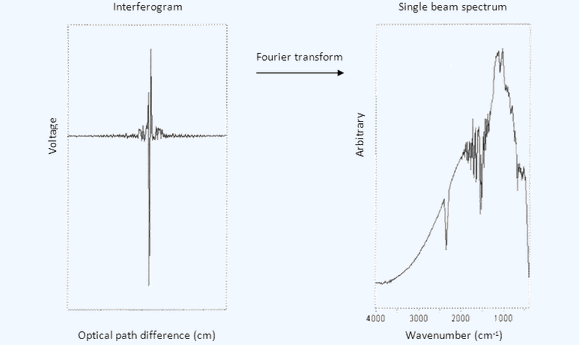 In a Michelson interferometer an optical path difference is introduced between the two beams by translating the moving mirror away from the beamsplitter. A general property of (optical) waves is that their amplitudes are additive. When the beams that have reflected off the fixed and moving mirrors recombine at the beamsplitter are in phase, an intense beam leaves the interferometer as a result of constructive interference. When the fixed and moving mirrors beams are recombined at the beamsplitter and the waves are completely out of phase, a low intensity beam leaves the interferometer as a result of destructive interference. A plot of light intensity versus optical path difference is called an interferogram. In fact, the interferogram is a measurement of the temporal coherence of the light at each different time delay setting. With the use of Fourier transformations it is possible to convert a signal in the time domain to the frequency domain (i.e. the spectrum). The fundamental measurement obtained by an FTIR is made in the time domain, which is Fourier transformed to give a spectrum (see figure). This is where the term Fourier Transform IR spectroscopy comes from.