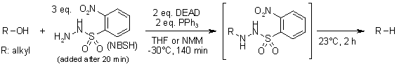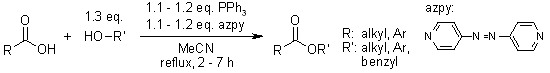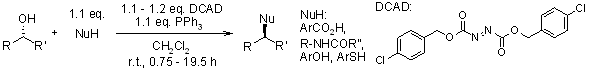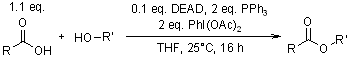 The Mitsunobu Reaction allows the conversion of primary and secondary alcohols to esters, phenyl ethers, thioethers and various other compounds. The nucleophile employed should be acidic, since one of the reagents (DEAD, diethylazodicarboxylate) must be protonated during the course of the reaction to prevent from side reactions.