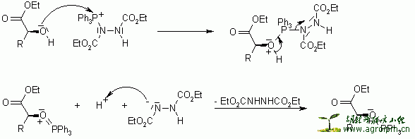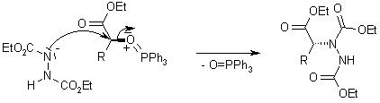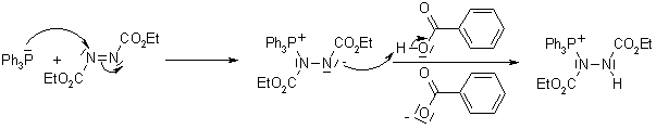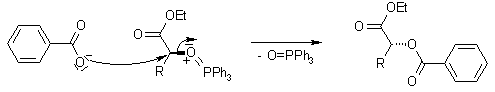 The triphenylphosphine combines with DEAD to generate a phosphonium intermediate that binds to the alcohol oxygen, activating it as a leaving group. Substitution by the carboxylate, mercaptyl, or other nucleophile completes the process.
