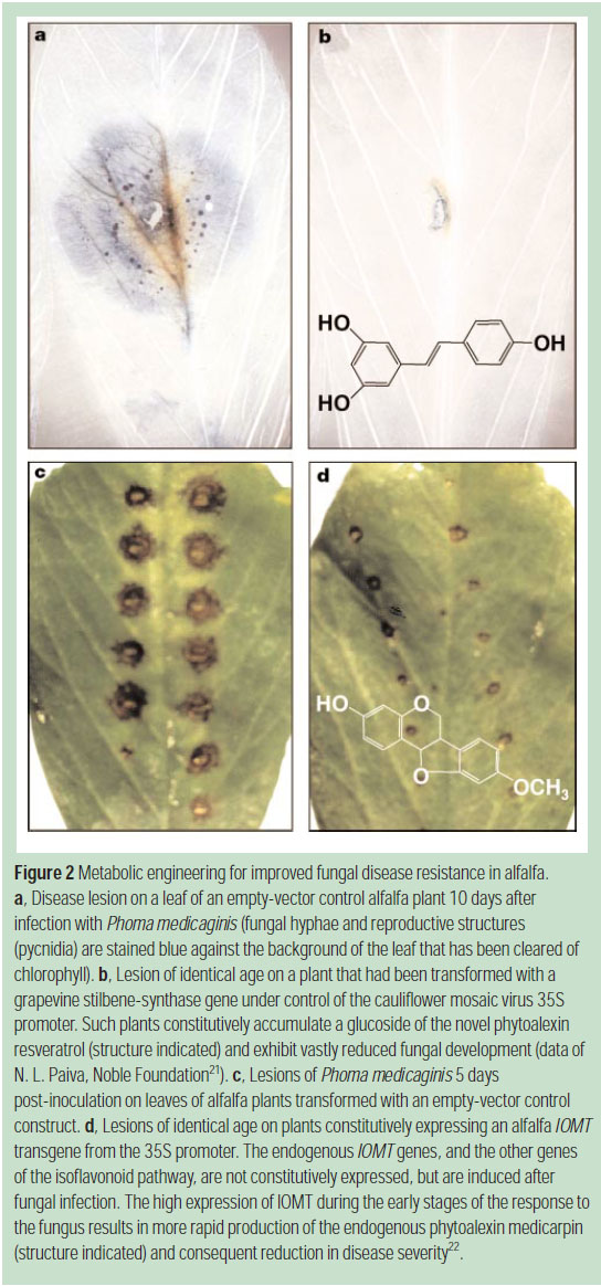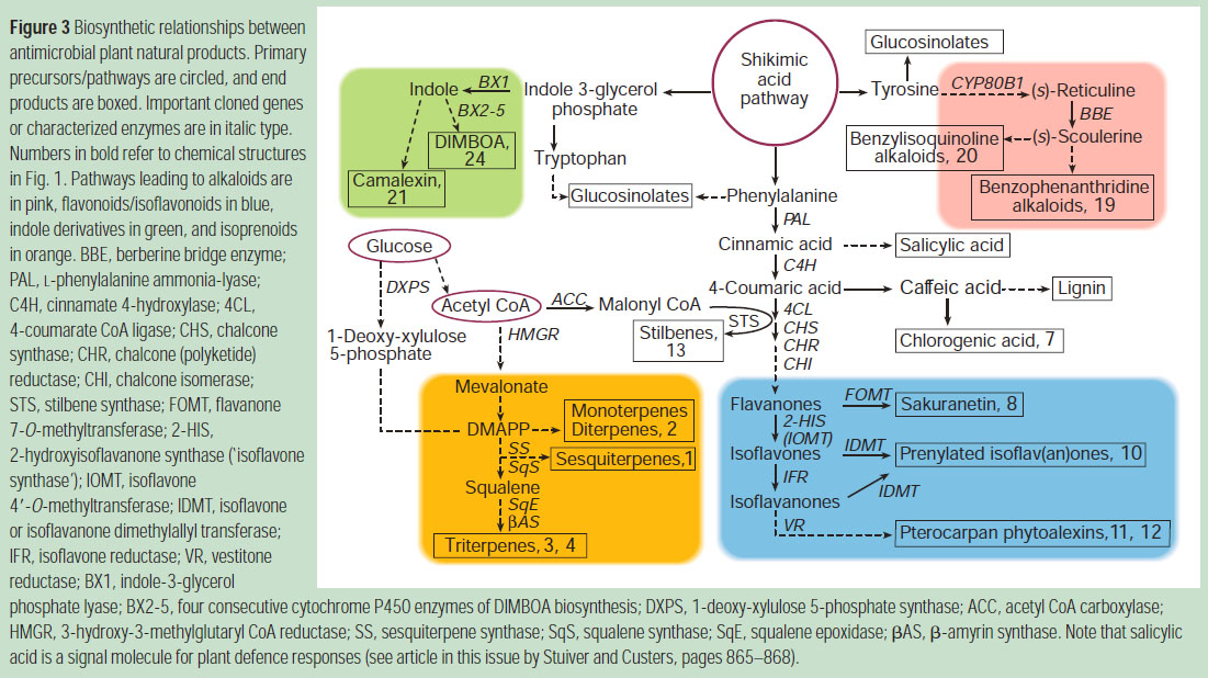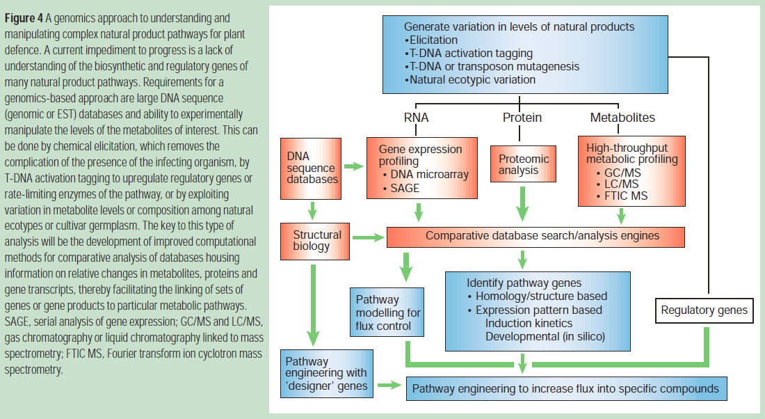 Plants elaborate a vast array of natural products, many of which have evolved to confer selective advantage against microbial attack. Recent advances in molecular technology, aided by the enormous power of large-scale genomics initiatives, are leading to a more complete understanding of the enzymatic machinery that underlies the often complex pathways of plant natural product biosynthesis. Meanwhile, genetic and reverse genetic approaches are providing evidence for the importance of natural products in host defence. Metabolic engineering of natural product pathways is now a feasible strategy for enhancement of plant disease resistance.