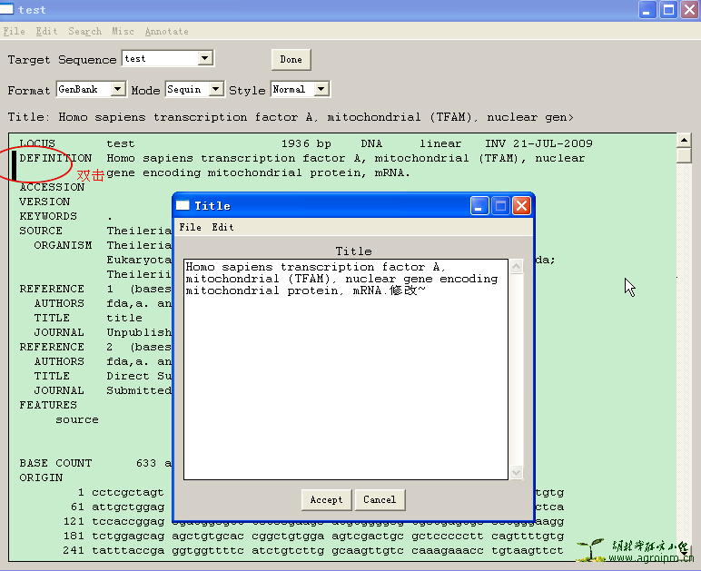 上面的步骤都完了之后。出现一个GenBank格式的界面,如下图。在这里,一切信息就一目了然。那里不对,需要修改的。双击就行了。另外,在Edit菜单可以修改作者、联系方式等资料。