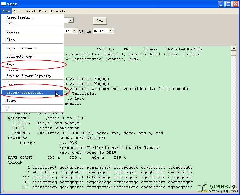 如果在中途要临时保存,在File菜单的Save,保存后的文件是.sqn。全部修改完毕后,选择File/Submission。就会有一个提示框,提示把保存后的发送一封邮件到NCBI。