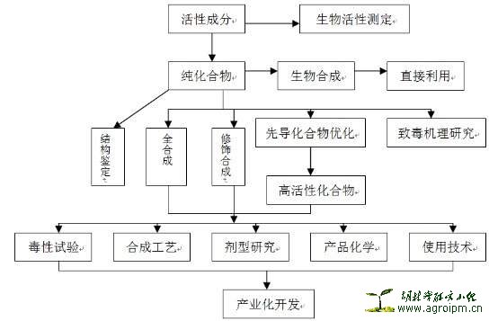 从植物材料到具有生物活性的农药产品需经历五个步骤,包括有效成分的活性追踪、有效成分分离与精制、活性成分结构研究、活性成分构效关系及分子设计、生物合理设计。前四个步骤和植物化学非常相似,而生物合理设计有所不同。