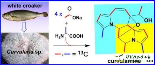 从植物内生菌Curvularia sp. IFB-Z10中分离到一个全新的骨架Curvulamine,作者对此进行了详细的结构解析,利用Cu靶衍射和ROESY确定了立体构型。并做了抗病毒活性评价。然后通过同位素示踪、再培养方法,推断了Curvulamine的生物合成途径。