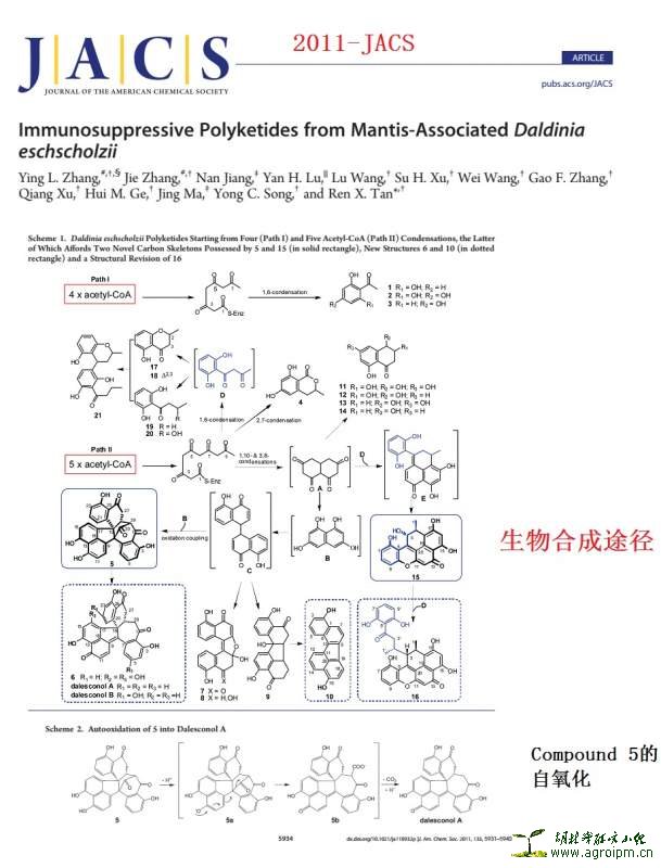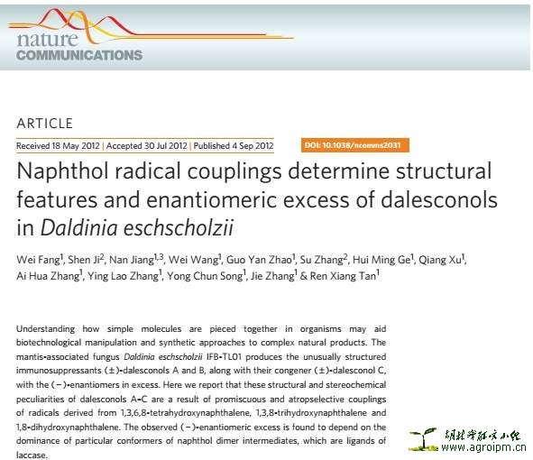 在以两篇大作的基础上,作者深层次研究发现了螳螂肠道真菌(Daldinia eschscholzii)产生的结构全新的Dalesconol类免疫抑制物及其独特的“异构体冗余现象”。随后该群体系统分析研究了该真菌的生物合成代谢通路及其关联性;在此基础上的深入研究发现Dalesconol类免疫抑制物是由不同的萘酚通过酚氧游离基耦合产生的,同时发现其“异构体冗余现象”现象很可能源于真菌漆酶引致的关键中间体优势构象。该成果不仅为此类免疫抑制物来源问题的解决奠定重要基础,而且为酚类合成生物学研究提供新的思路和概念。相关成果发表在Nature communications杂志(2012)。由于本人知识浅薄,对此部分内容不是很懂,相关报道可见文献原件(见附件)和相关网页。