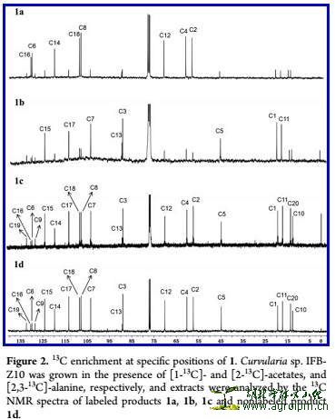 首先作者巧妙地将C-1和C-2用13C标记的乙酸钠盐(CH3COONa)分别加入菌种中,再分别的重新培养、发酵、分离、鉴定,发现两者的分别相隔地一些C信号增强(见图1a和1b)。然而C-9、C-10、 C-19、C-20的四个碳信号并未增强。