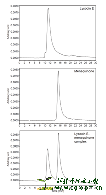 最后,作者想分析lysocin E与甲基萘醌在抑菌过程中是否存在相互作用。先外源性地添加甲基萘醌到S. aureus培养基,使得S. aureus对lysocin E的抗性呈现剂量性增加。加入泛醌(下图左b,哺乳动物呼吸链上辅酶),则对抗性没有影响。作者用微量量热法,直接分析lysocin E与甲基萘醌,lysocin E与泛醌相互作用的反应热,发现只有lysocin E与甲基萘醌存在共沉淀结合反应。作者通过凝胶过滤实验分析lysocin E与甲基萘醌结合体(下图右),当结合体溶于有机溶剂后,lysocin E和甲基萘醌都在HPLC中出峰,说明两者的结合是非共价作用。为了验证甲基萘醌与lysocin E的相互作用能破坏细胞膜,作者设计实验,先分别构建含甲基萘醌,不含甲基萘醌的人工脂质体,再利用lysocin E加入后,测量钙黄绿素的荧光值来衡量脂质体膜的破坏情况。结果表明,lysocin E选择性的破坏含甲基萘醌的脂质体膜。