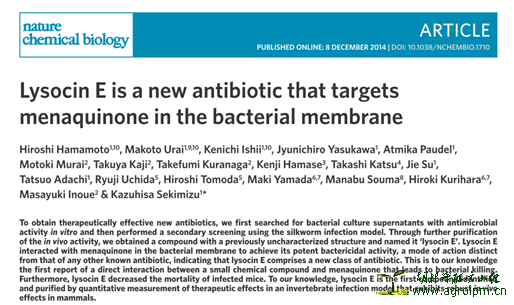 文献 Hamamoto, H.; Urai, M.; Ishii, K.; Yasukawa, J.; Paudel, A.; Murai, M.; Kaji, T.; Kuranaga, T.; Hamase, K.; Katsu, T.; Su, J.; Adachi, T.; Uchida, R.; Tomoda, H.; Yamada, M.; Souma, M.; Kurihara, H.; Inoue, M.; Sekimizu, K. Nat Chem Biol 8 December 2014; doi:10.1038/nchembio.1710
