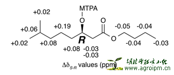 平面结构:作者从含量最大的lysocin E下手,用NMR1D和2D结合高分辨质谱技术,鉴定出其平面结构为环12肽并带3-OH-5-Me-hexanoic acid 支链。值得注意的是,日本学者在运用MS/MS串联质谱技术解析环肽,聚醚类分子量大,结构较复杂的化合物方面做的很好。作者从Thr1-碳位移偏低场,推测Thr1与Thr2是酯键相连,为印证此推测,作者分别用弱碱水解lysocin E成线性寡肽于普通水和O18标记水中,再加NaBH 4还原,分析其还原前后,标记与未标记的样品MS/MS高分辨质谱,证明Thr1与Thr2确实是酯键相连。
