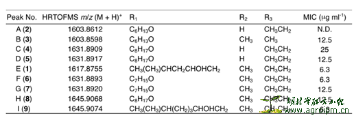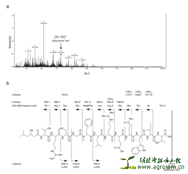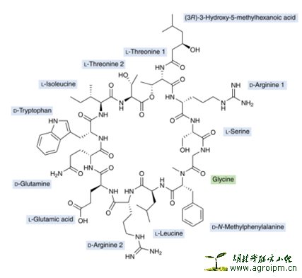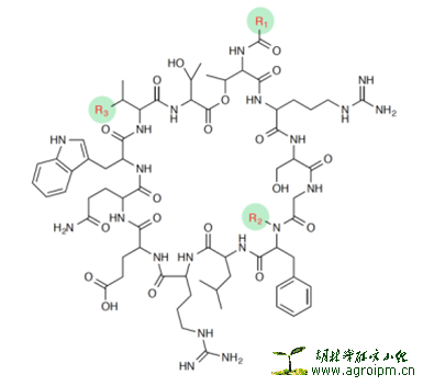 立体结构:环肽部分的绝对构型用2D-HPLC技术进行确定,其中为了区分Glu和Gln,用了赫夫曼重排,由于Glx在2D-HPLC中是L型和D型1:1出现的,赫夫曼重排将Gln转换成2,4-二氨基苯甲酸,2D-HPLC中只出现L型Glx,所以,Gln是D型,Glu是L型。3-OH-5-Me-hexanoic acid 支链部分3位绝对构型用Mosher反应来确定,是R型。