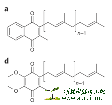为了寻找与lysocin E抗菌活动相关的细菌基因,作者运用了温度-敏感-表型的抗性基因筛选实验。具体来说,就是以往一系列在抗生素耐药性上的经典实验证明,菌株对药物的抗性与温度-敏感-表型有关联。细菌群落中的耐药性温度敏感型菌株往往存在针对某一抗生素的基因突变。一旦针对某一抗生素的耐药性温度敏感菌株找到了,就可以通过寻找与温度敏感性相关的基因来找到耐药性相关基因。作者首先筛选到经过甲硫磺酸乙酯(诱发点突变的突变剂)处理的S. aureus RN4220温度敏感型突变菌株,这些突变菌株有耐lysocin E活性,再用来自野生型S. aureus RN4220菌株基因文库的基因进行回补,直到回补质粒涵盖的基因区域有menA开发阅读框时,温度敏感表型回复正常。基因分析表明,突变基因组在menA中存在点突变(G98A),导致一个氨基酸的G33D被取代。menA的产物参与甲基萘醌的合成,而甲基萘醌(下图左a)是细菌膜上呼吸电子传递链一种辅酶。