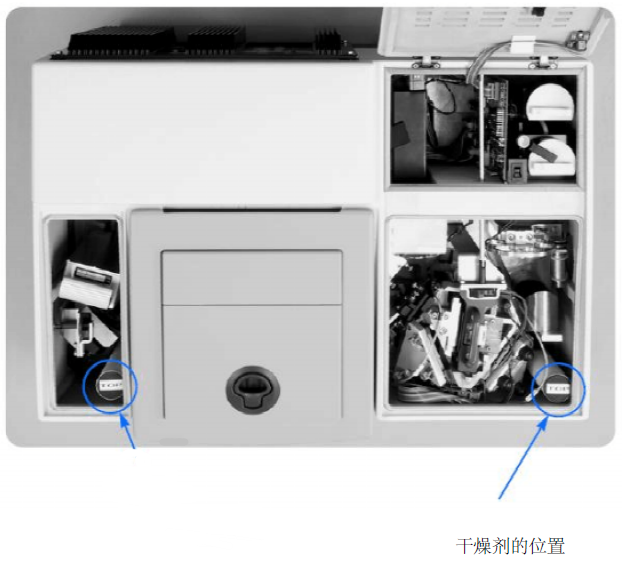 当位于仪器的右上角的红色电子湿度指示灯(I灯)闪烁时,应立即更换干涉仪仓室内的干燥剂(分子筛除潮剂)(图 1)。若仪器长期不用,则必须至少每两星期更换一次干燥剂并且每周至少开启主机一次,每次开机时间不低于4小时。样品仓内应放置变色硅胶作干燥剂。干涉仪仓室干燥剂的再生和更换步骤: