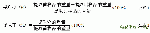 提取率可通过样品提取前后重要或提取物重量进行计算。无论采用哪一种方法进行计算,植物样品在提取前均应称重,供试样品重量高于100g时,可精确到0.1g,样品量较少时应至少精确到0.01g。应注意由于提取过程及称量中的一些误差,(提取前样品的重量-提取后样品的重量)与提取物的重量之间会存在一定的差异。