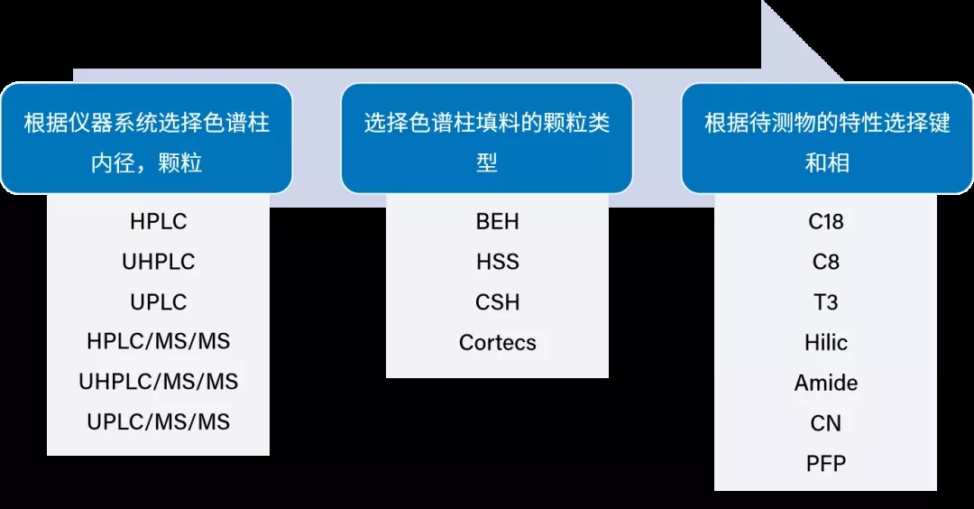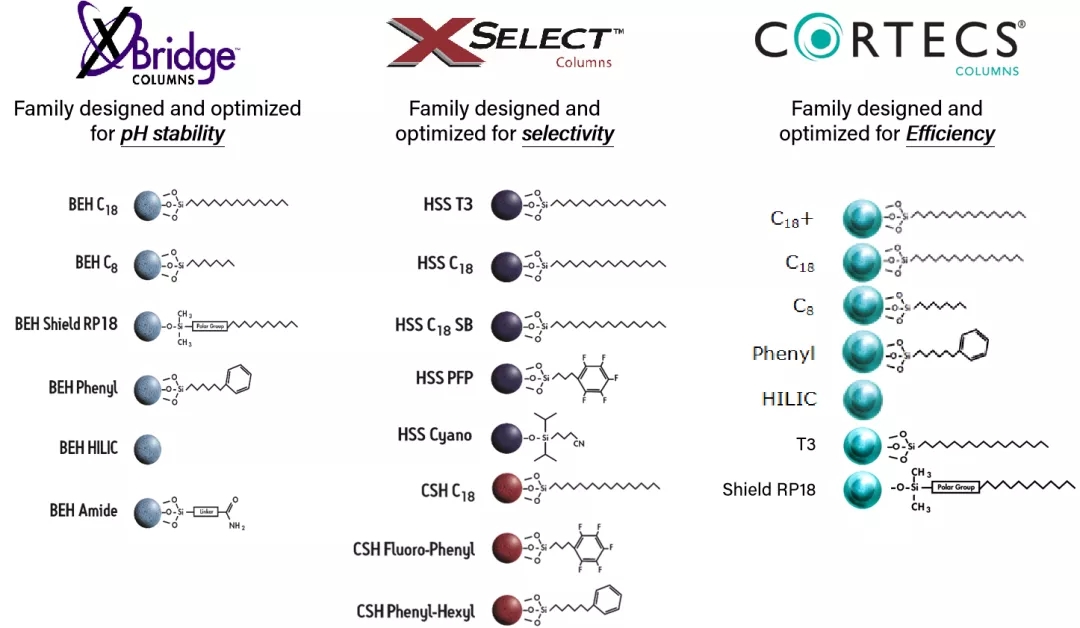 不同的基础填料具有不同的分离性能,沃特世有四大填料平台,每种填料种类都有对应的HPLC-UHPLC-UPLC的色谱柱,实验人员可以根据实际仪器的情况进行选择。