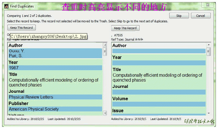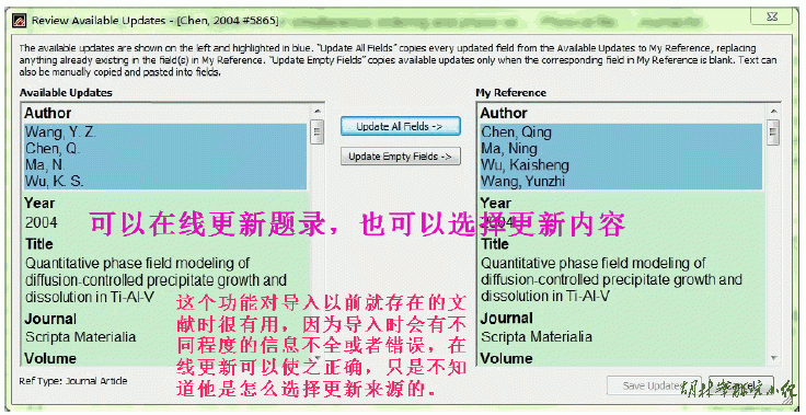 2. 增加文献记录更新功能,在菜单的reference下或者右键菜单中有find reference updates(一次更新一个),也可以复制特定的内容到旧的题录里,(不知道怎么选择更新来源的,好多文献信息来自不同的数据库);