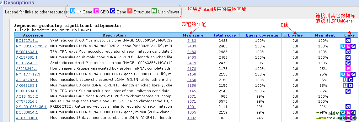 6,blast结果的描述区域。注意分值与E值。分值越大越靠前了,E值越小也是这样。
