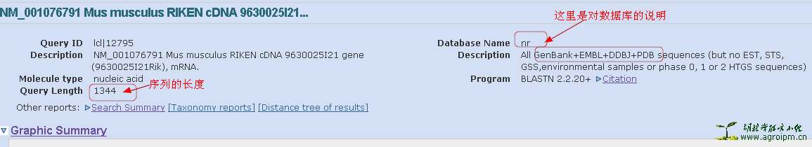 7,blast结果的详细比对结果。注意比对到的序列长度。评价一个blast结果的标准主要有三项,E值(Expect),一致性(Identities),缺失或插入(Gaps)。加上长度的话,就有四个标准了。如图中显示,比对到的序列长度为1405,看Identities这一值,才匹配到1344bp,而输入的序列长度也是为1344bp(看上面的图),就说明比对到的序列要长一点。由Qurey(起始1)和Sbjct(起始35)的起始位置可知,5'端是是多了一段的。有时也要注意3'端的。