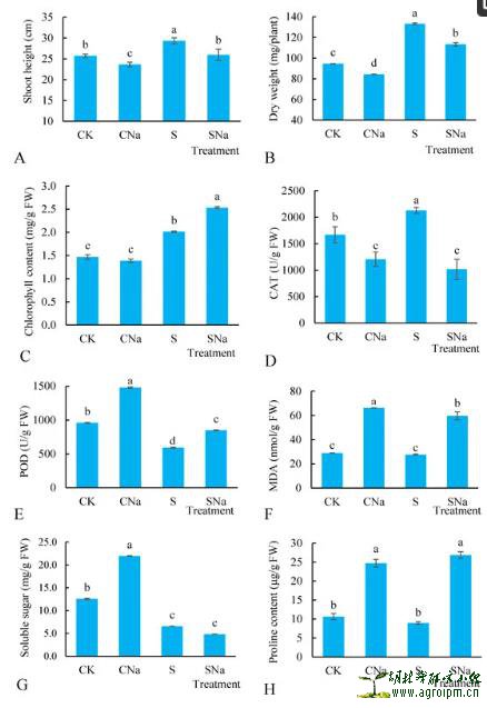 H). CK, CNa, S, and SNa represent control soil, NaCl soil, HU2014 soil, and inoculated HU2014 soil with the addition of NaCl, respectively. CAT represents catalase. POD represents peroxidase. MDA represents malondialdehyde. The data are presented as the mean ± SD of three independent replicates. Lowercase letters indicate significance (