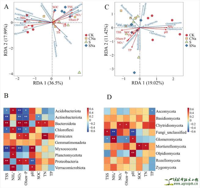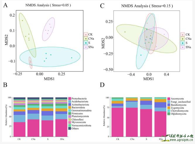 Figure 4. Non-metric multidimensional scaling ordination plots derived from the Bray–Curtis distance matrix (A,C) and relative abundance of the dominant bacterial (B) and fungal (D) taxa in different treatments. CK, CNa, S, and SNa represent control soil, NaCl soil, HU2014 soil, and inoculated HU2014 soil with the addition of NaCl, respectively. The configuration stresses were bacteria 0.05 and fungi 0.15. Samples are clustered together by different treatments.