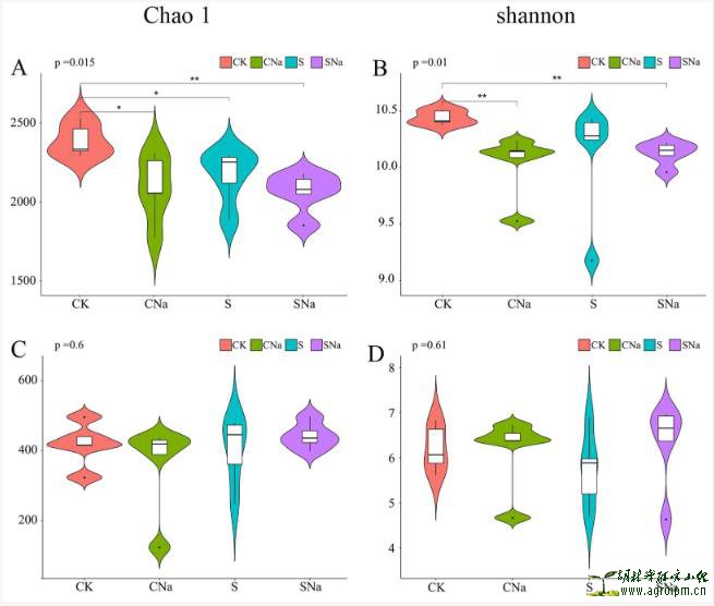 D) alpha diversity among the treatments. (The data are presented as the mean ± SD of three independent replicates. CK, CNa, S, and SNa represent control soil, NaCl soil, HU2014 soil, and inoculated HU2014 soil with the addition of NaCl, respectively.) Asterisks indicate significant differences (