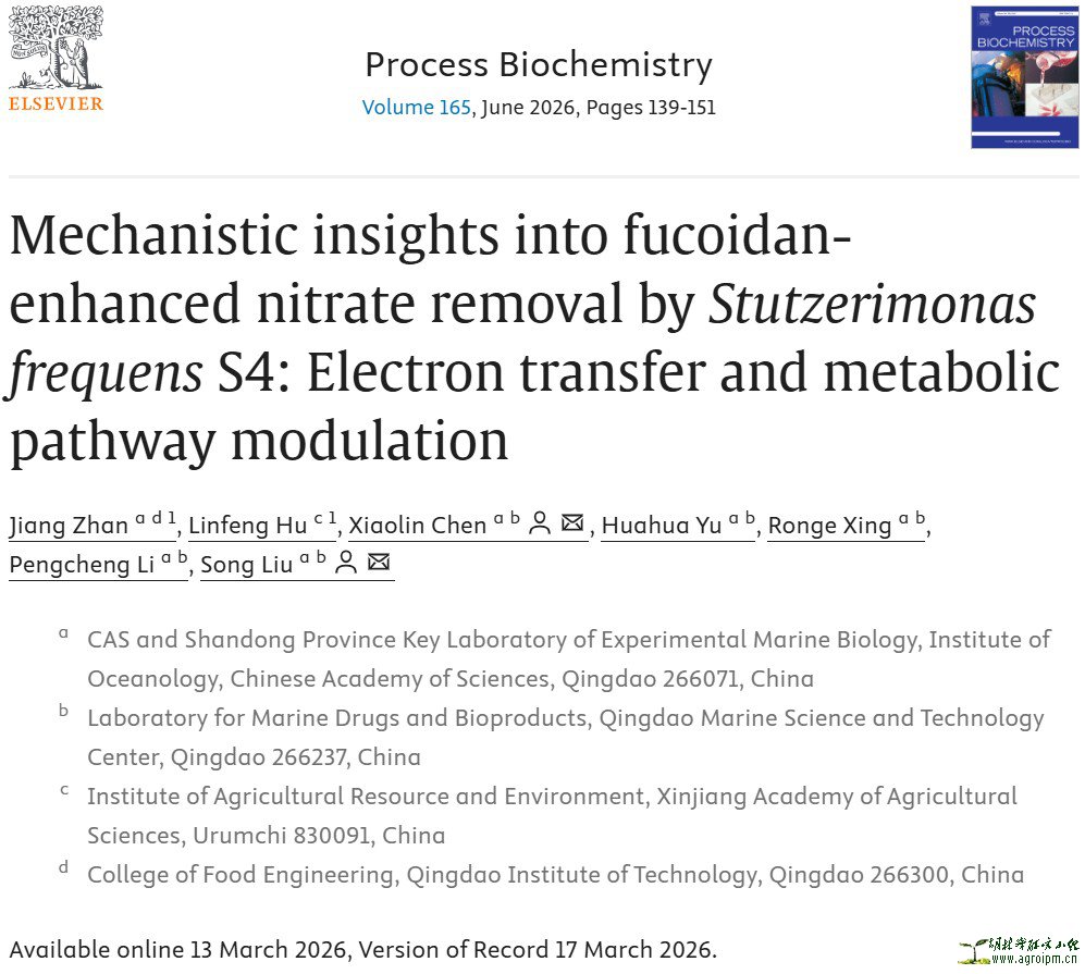 硝酸盐是导致土壤次生盐渍化的主要阴离子。然而,由于去除速率缓慢、产生毒性副产物以及造成氮素损失,微生物反硝化作用在土壤修复中的应用受到限制。本研究首次发现,褐藻糖胶(fucoidan)作为外源营养刺激剂可显著促进施氏假单胞菌(Stutzerimonas frequens)S4的生长并提高其硝酸盐去除效率。与对照组相比,9–18 h内硝酸盐去除效率提升了58.62%,去除速率由28.64 mg/L/h提高至48.42 mg/L/h。机制研究表明,去除速率的提升与褐藻糖胶促进的电子传递活性增强密切相关;同时,嘌呤、核酸及辅因子合成等代谢通路上调,为微生物生长及反硝化作用提供了能量。此外,褐藻糖胶可调控硝酸盐转化通路,提高硝酸盐同化比例,从而减少亚硝酸盐及气态氮素的排放,并提升有机氮和胞内氮水平。转录组学分析显示,褐藻糖胶通过显著抑制反硝化功能基因并上调同化相关基因实现上述效应。本研究阐明了褐藻糖胶增强微生物硝酸盐去除能力的分子机制,为其在次生盐渍化土壤修复中的应用提供了新的理论依据。