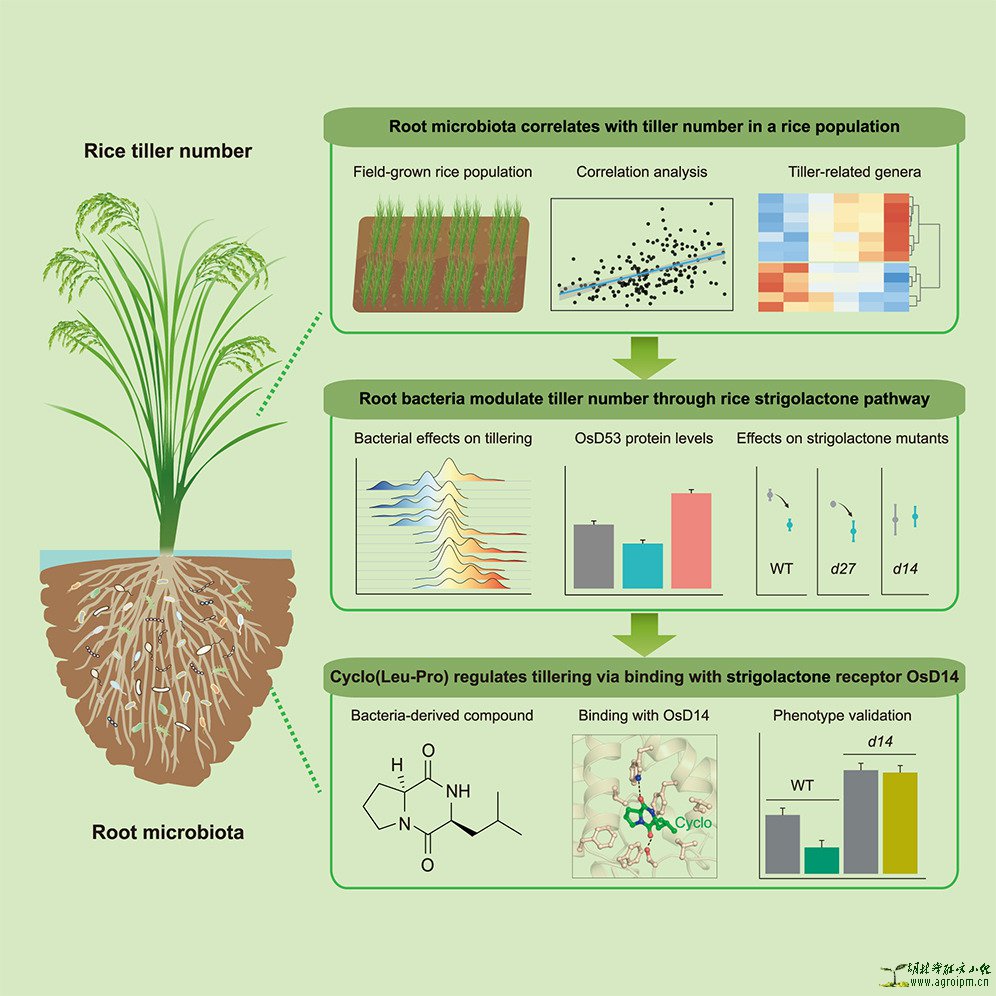 水稻分蘖是受植物遗传和环境因素调控的重要农艺性状。然而,根际微生物群在调控水稻分蘖中的作用机制尚未阐明。本研究通过分析182个已完成基因组测序的水稻品种在田间栽培条件下的根际菌群组成与分蘖数,揭示了根际微生物组成与水稻分蘖数间存在显著相关性。通过分离培养的细菌菌株,我们证实根际微生物群落中不同成员在实验室和田间条件下均能调控水稻分蘖。遗传学、生物化学与结构生物学分析表明,由抑制分蘖的细菌Exiguobacterium R2567产生的环(亮氨酰-脯氨酰)二肽,可通过结合独脚金内酯受体OsD14激活水稻独脚金内酯信号通路,从而调控分蘖过程。本研究揭示了根部微生物群如何调控关键农艺性状,并为可持续农业中利用根部微生物群优化作物生长提供了一种前景广阔的读档策略。