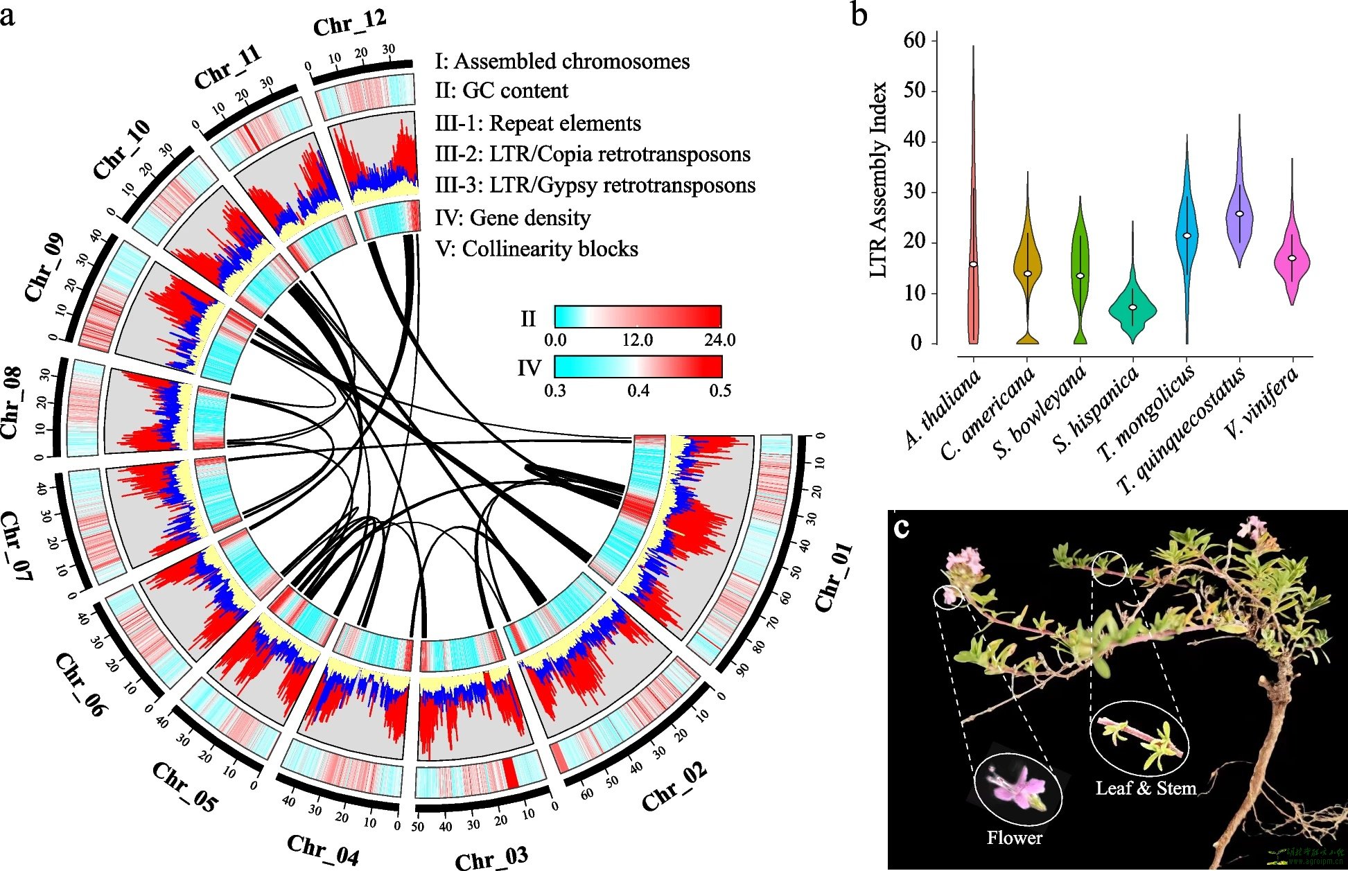The features of Thymus mongolicus genome. a The landscape of T. mongolicus genome. The circus plot from the outer to the inner circle represents chromosome-scale pseudochromosomes (Chr01–Chr12) (I), GC content (II), repeat element (III-1), Ty1/copia retrotransposons (III-2), Ty3/gypsy retrotransposons (III-3), gene density (IV), and each linking line in the center of the circus plot indicates the collinearity blocks panning more than 40 genes in the genome (V). b LTR assembly index (LAI) analysis for the referenced genomes. c T. mongolicus plant